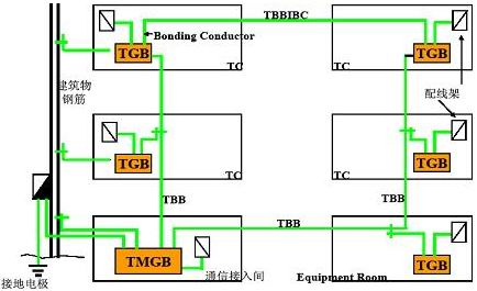 • 當(dāng)建筑物中使用兩個或多個垂直接地互聯(lián)主干時,為了保證接地互聯(lián)主干之間電位相等,接地干線之間每隔三層及頂層需用接地互聯(lián)主干互聯(lián)導(dǎo)體(Telecommunications Bonding Backbone Interconnecting Bonding Conductor ,簡稱TBBIBC)相聯(lián)結(jié)。